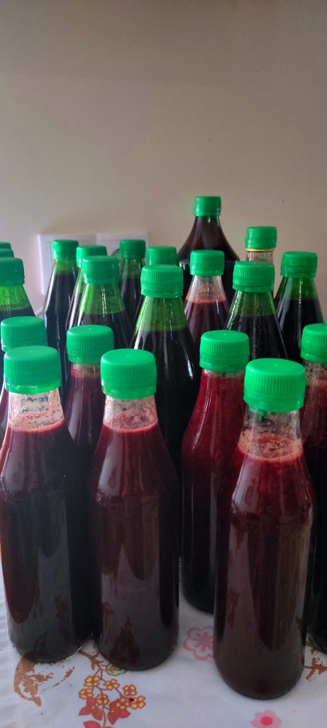 man kann aber den Zucker erst dem fertigen Saft beigeben und dann nochmals aufkochen, jeder hat hier seine eigene Methode. Wichtig ist aber Flaschen steril zu machen und heiß abfüllen sowie das sofortige Verschließen.