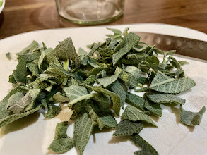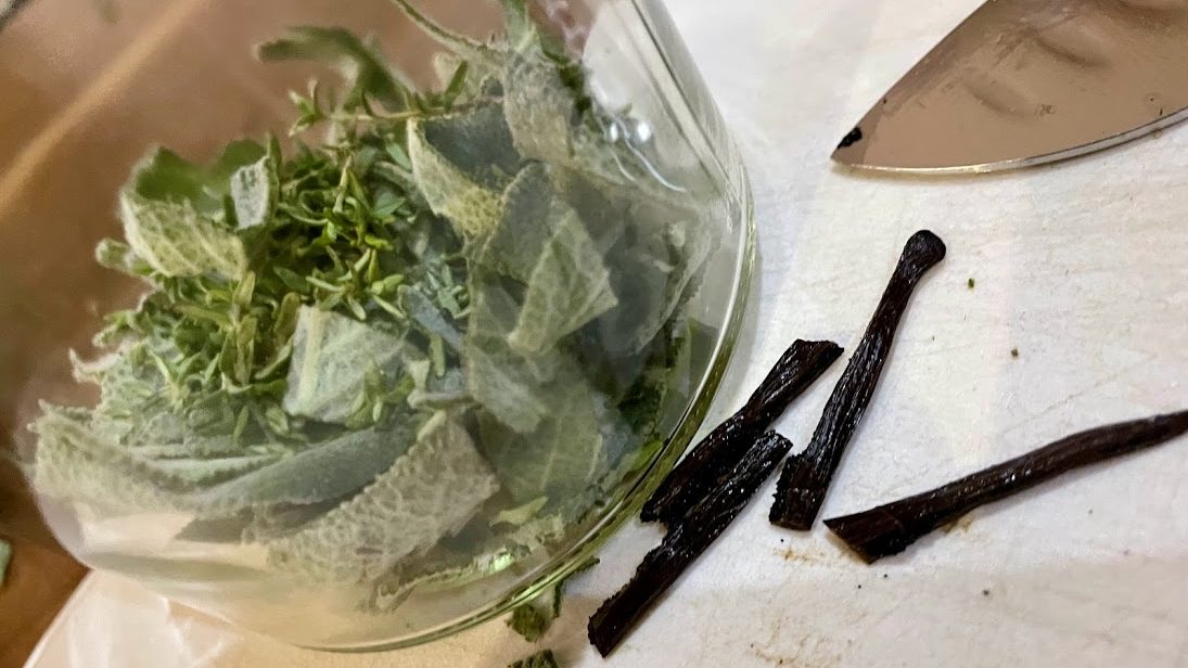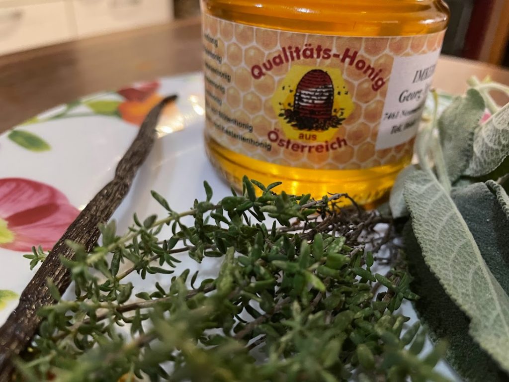Für ein 200ml Glas Honig habe ich einige Salbeiblätter, Thymian abgerebelt und ein kleines Stück Vanilleschote genommen. Die Kräuter werden feingehackt, Vanilleschote aufschneiden, das Mark auskratzen und in den Honig einrühren. Die Kräuter und die Vanilleschote kommen ebenfalls in das Glas mit Honig. Verschlossen zieht er dann sechs Wochen. Die Vanilleschoten habe ich bei Vanilla Aid gekauft, bekommt man auch am Samstag am Bauernmarkt in Oberwart und auch in der Carla in Oberwart.