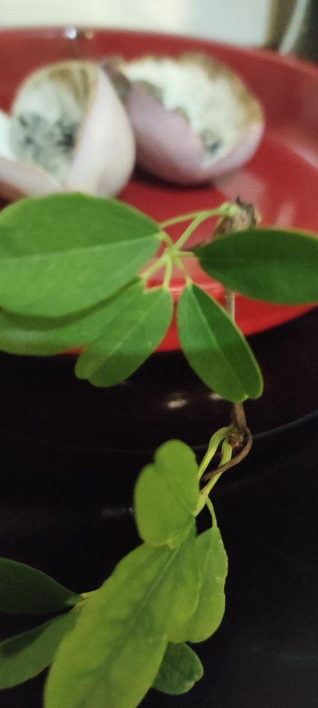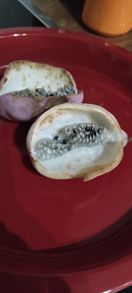 Eigentlich ie Fingerblättrige Akebie, auch Fünfblättrige Akebie eine aus Asien stammende Kletterpflanze. Die dunkelroten Blüten riechen nach Schokolade, daher wird sie auch Schokoladenwein genannt. Der Duft ist sehr intensiv nach dunkler Schokolade. Fast übersehen haben wir heuer die ersten Früchte. Das weißliche, leicht feste Fruchtfleisch ist mit den Samen durchsetzt und schmeckt süss nach Honig und Vanille.