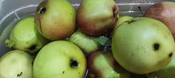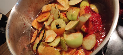 Ich habe hier 2 kg sehr reife Dirndln genommen, 1.5 kg grüne Äpfel,Mark einer 1/2 Vanilleschote, 1 kg Zucker, Saft einer halben Zitrone.