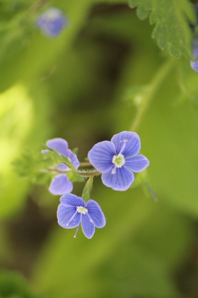 Die Blüten des Gamander-Ehrenpreis sind das auffälligste Merkmal der Pflanze. Sie bestehen aus vier Blütenblättern, die ein tiefes Blau mit einem helleren Zentrum zeigen. In der Mitte der Blüte befinden sich zwei auffällige Staubblätter und ein Fruchtknoten. Diese Farbenpracht zieht zahlreiche Insekten an, insbesondere Bienen und Schmetterlinge, die die Blüten bestäuben.