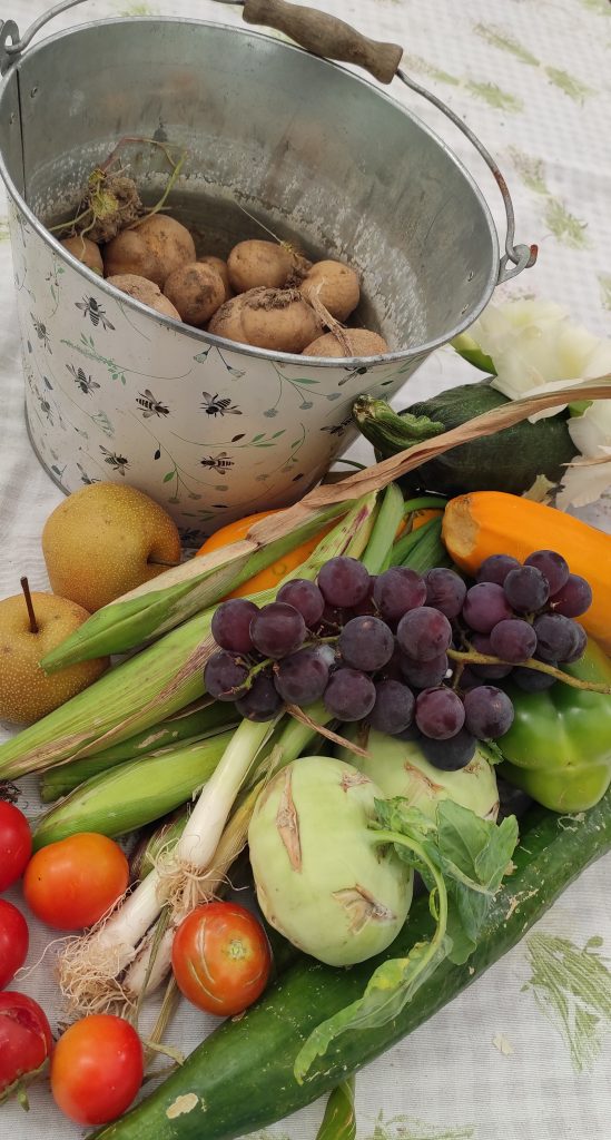 Kartoffeln, der letzte Mais, Tomaten, Gurken, Paprika, Chilis in allen Variationen (sind die heuer höllisch scharf 😎), Wurzelgemüse , das ist jetzt im Gemüsegarten alles zum ernten. Yucon, Knollenziest, Mangold, Karotten, kommen in den nächsten Wochen in den Topf.