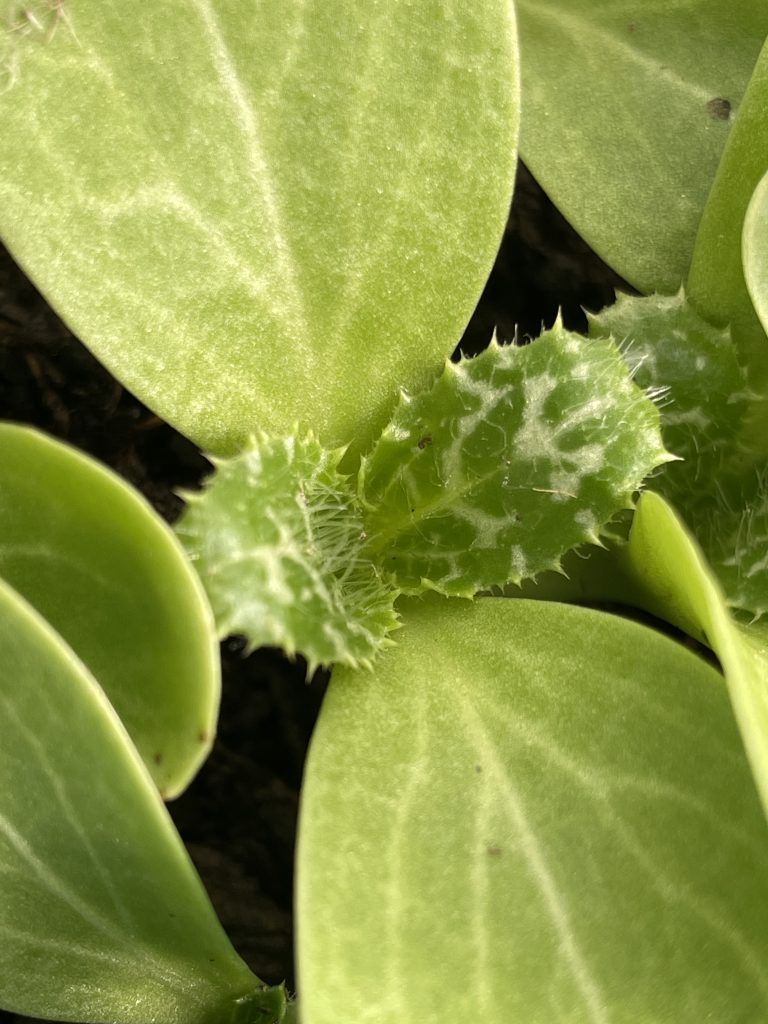 Die Mariendistel hat nun nach den Keimblättern ihre ersten typischen Blätter entwickelt. Diese Blätter sind an ihrer markanten, weiß geäderten Musterung zu erkennen, die ihnen ein gesprenkeltes Aussehen verleiht.