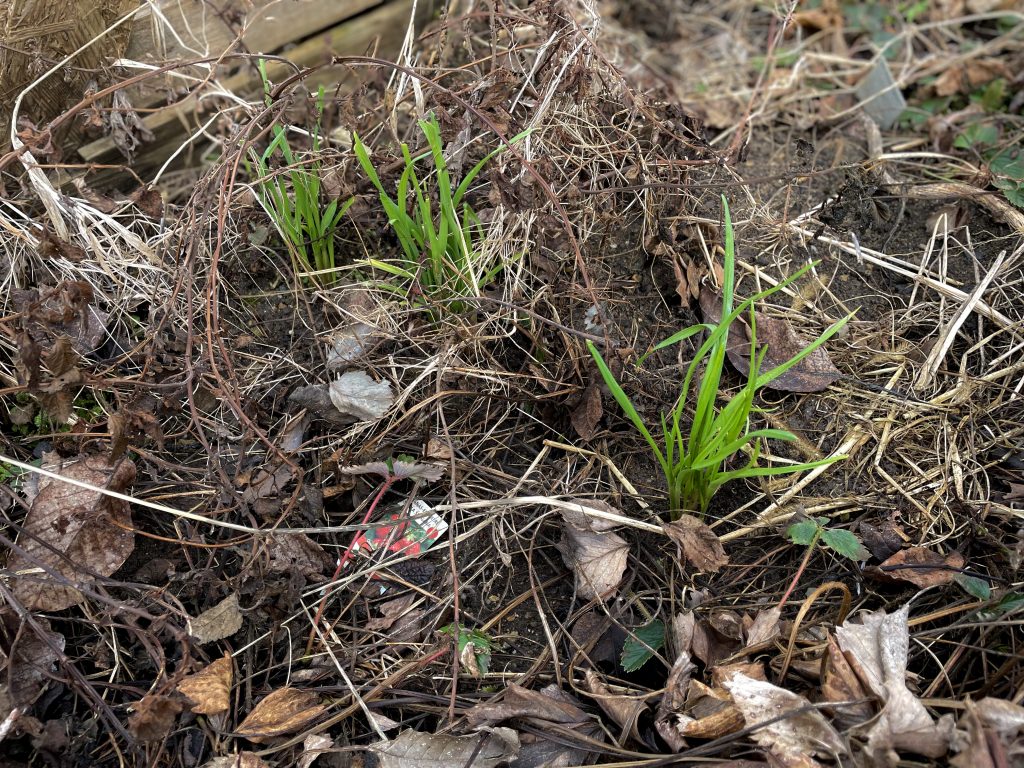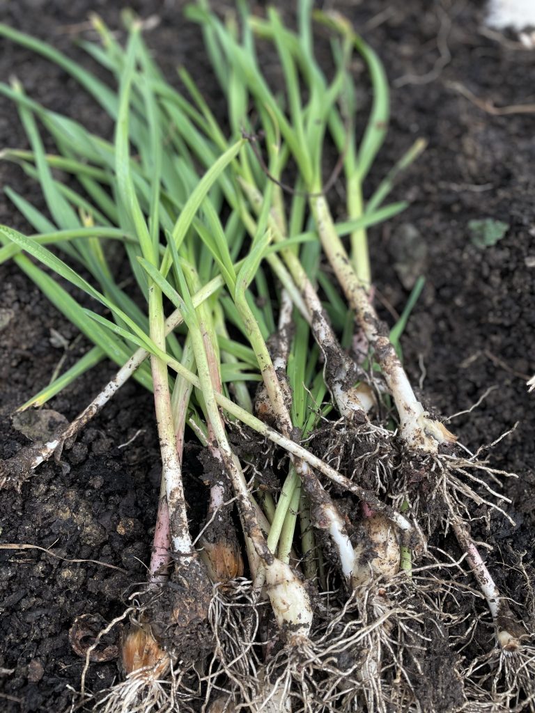 Ich könnte ja im Herbst jede Zehe einzeln stecken, aber mir ist schon passiert das ich dann vergessen oder übersehen habe wo ich die sie versteckt hatte. Daher nehme ich im Herbst einen ganze Knolle, breche sie etwas aufeinander und ab in die Erde damit. Im Frühjahr vereinzele ich die jungen Pflanzen und im Juli (je nach Wetter) gibt es dann frischen Knoblauch.