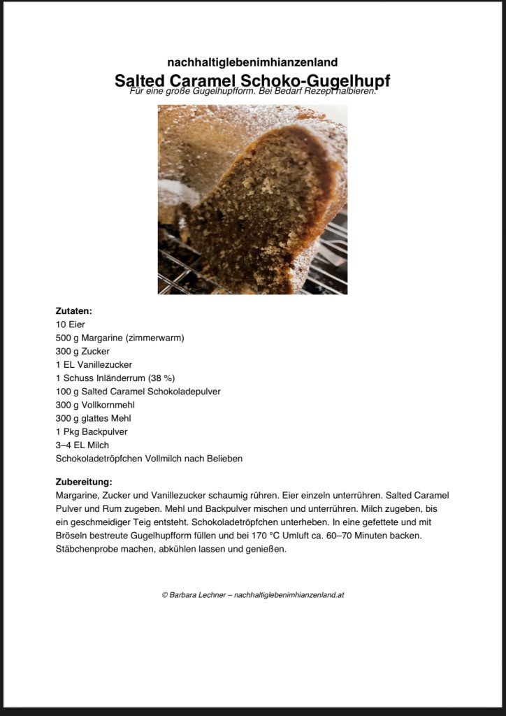 Die Idee ist schnell geboren: ein neuer Gugelhupf, der genau diese Aromen einfängt. Die frischen Eier geben ihm Struktur und Lebendigkeit, die Schokolade Tiefe, und das Salted Caramel diese feine, fast erwachsene Note. Während der Kuchen im Ofen langsam aufgeht, erfüllt dieser unverwechselbare Duft das ganze Haus. Es ist mehr als Backen. Es ist Vorfreude.