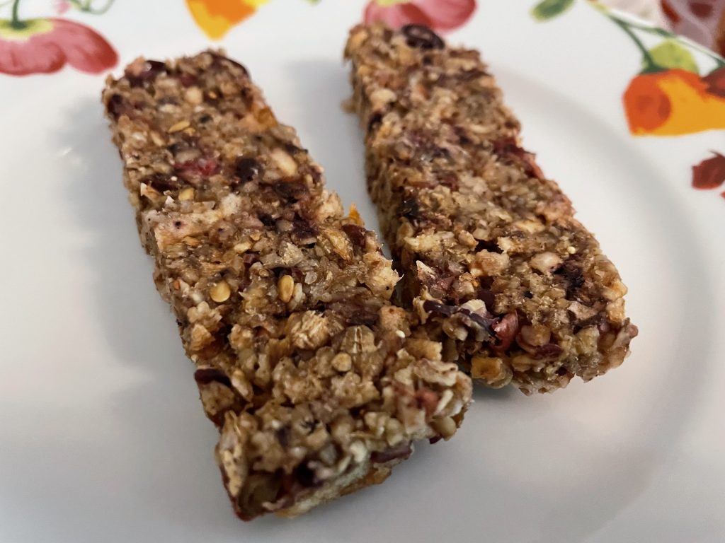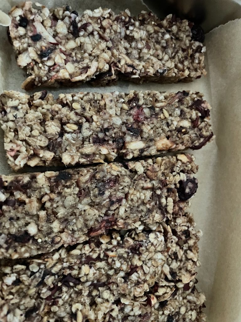 Ich verwende für meine Riegel das Dörrgerät „Dora“ von Springlane mit passenden Formen – die Riegel werden gleichmäßig, schön kompakt und besonders haltbar. (unbezahlte Werbung). Ich habe hier zwei Müslirformen und in den anderen Etagen trockne ich dann gleichzeitig Apfelchips. Mit der Hand geformt werden sie nicht so schön viereckig, aber es gibt auch Formen für das Backrohr. Man kann die Masse auch ca. 1cm dick auf ein Backpapier aufstreichen oder mit leicht feuchten Händen aufdrücken und vor dem Auskühlen in Riegel schneiden. Bei der Aufbewahrung Backpapiere oder Butterbrotpapier als Trenner zwischen benutzen.