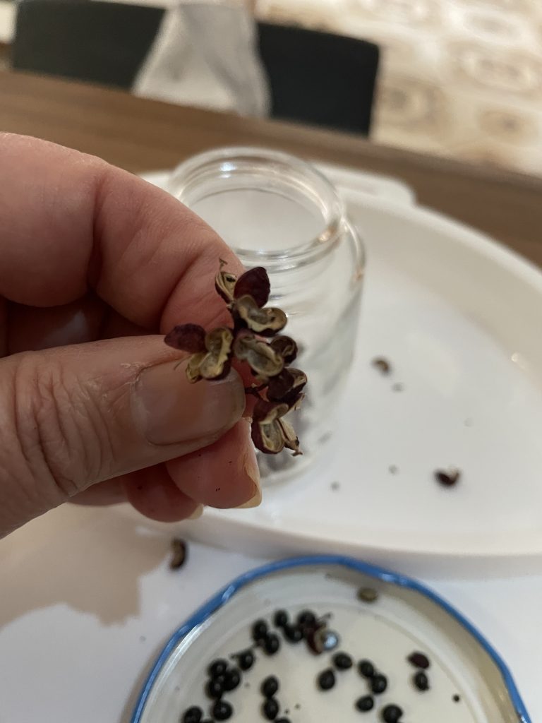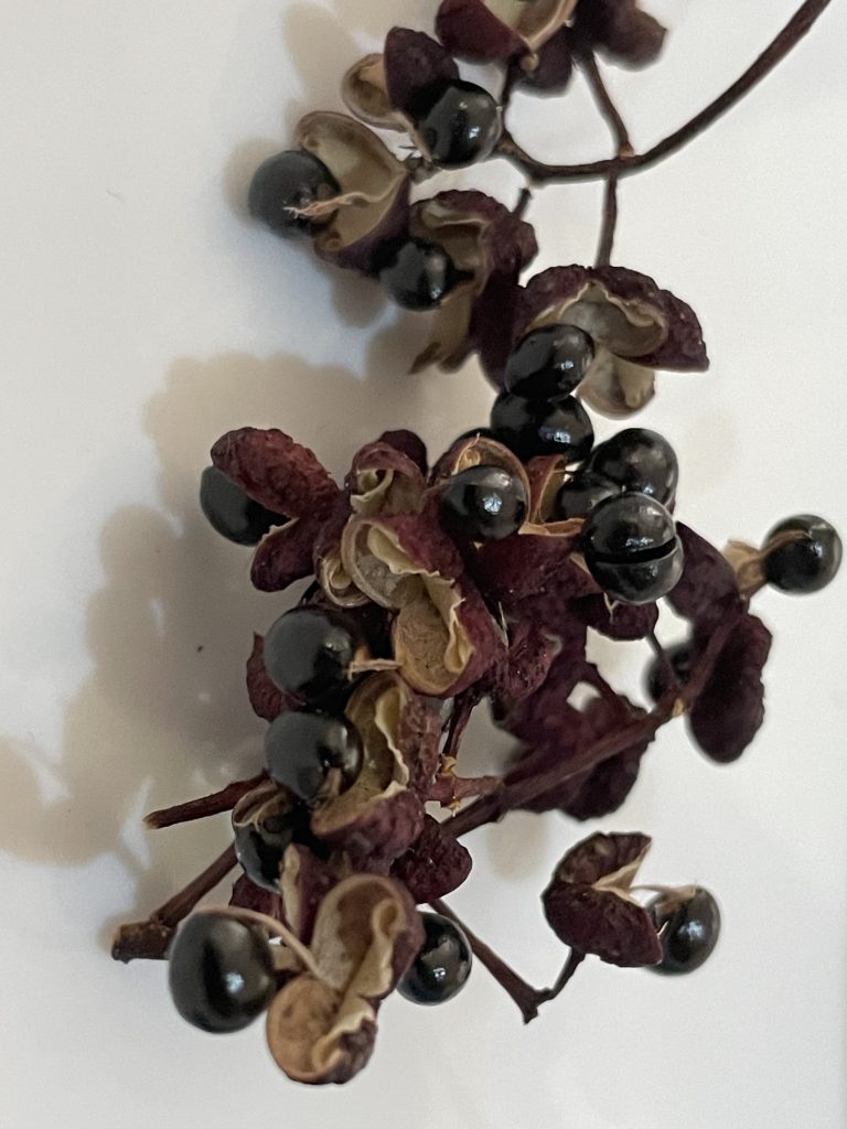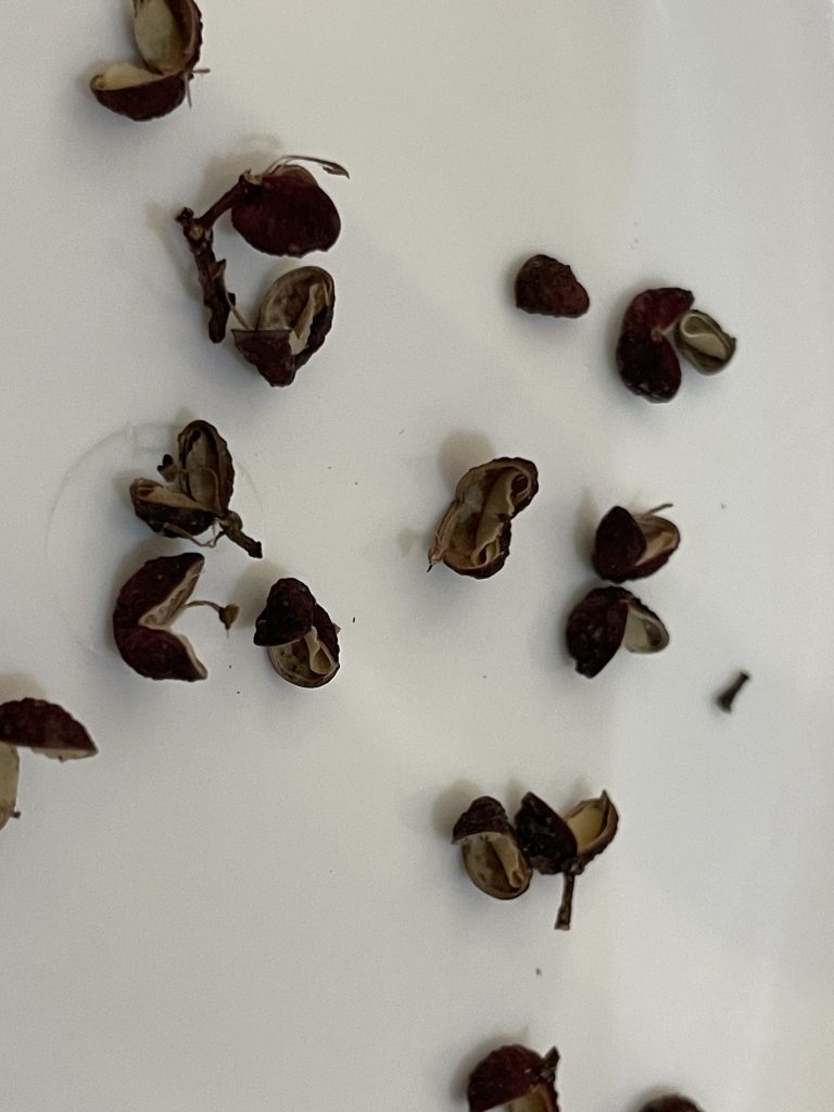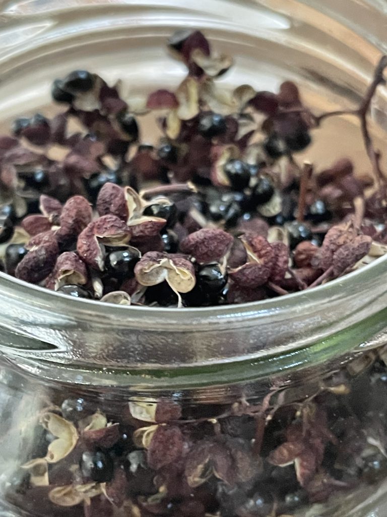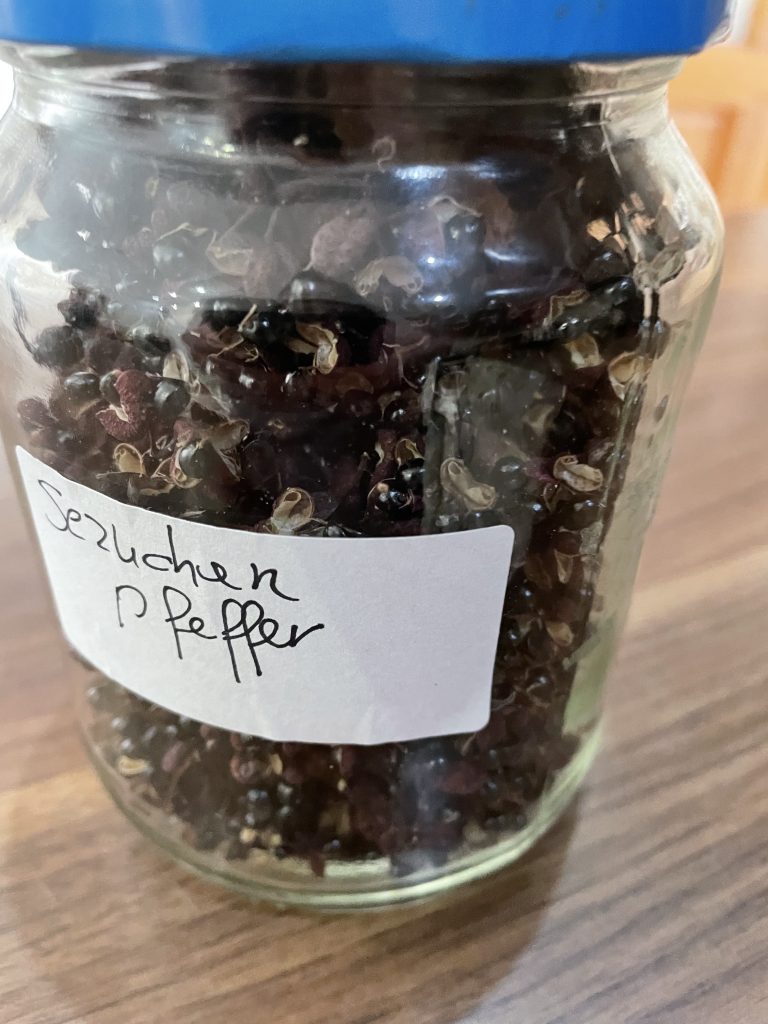 Die reifen Früchte ernte ich Ende August und trockne sie. Die Schalen werden von den befreit und kommen dann in einen Gewürzmühle. Ich mahle sie frisch, so bleibt das Aroma voll erhalten.